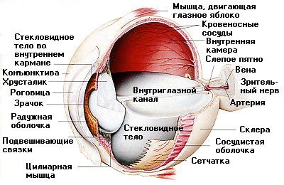 РАЙДУЖНА ОБОЛОНКА - передня частина судинного тракту. Круглий отвір у райдужній оболонці (зіниця) відіграє роль діафрагми ока. Основною функцією райдужної оболонки є регуляція кількості світла, яке потрапляє в око. Зміна форми зіниці вказує на запалення райдужки або порушення симпатичної і парасимпатичної іннервації.